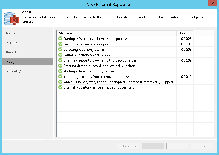 At the Apply step of the wizard, wait for Veeam Backup & Replication to install and configure all required components. Then click Next to complete the procedure of adding the external repository to the backup infrastructure.