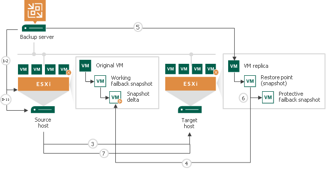 - Veeam Backup & Replication creates a failback protective snapshot for the VM replica. The snapshot acts as a new restore point and saves the pre-failback state of the VM replica. You can use this snapshot to return to the pre-failback state of the VM replica afterwards.
