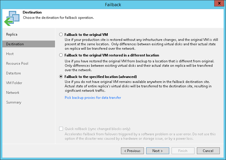 - Veeam Backup & Replication supports three possible failback destination variants. Note that the Failback wizard displays a different set of steps for every failback variant.