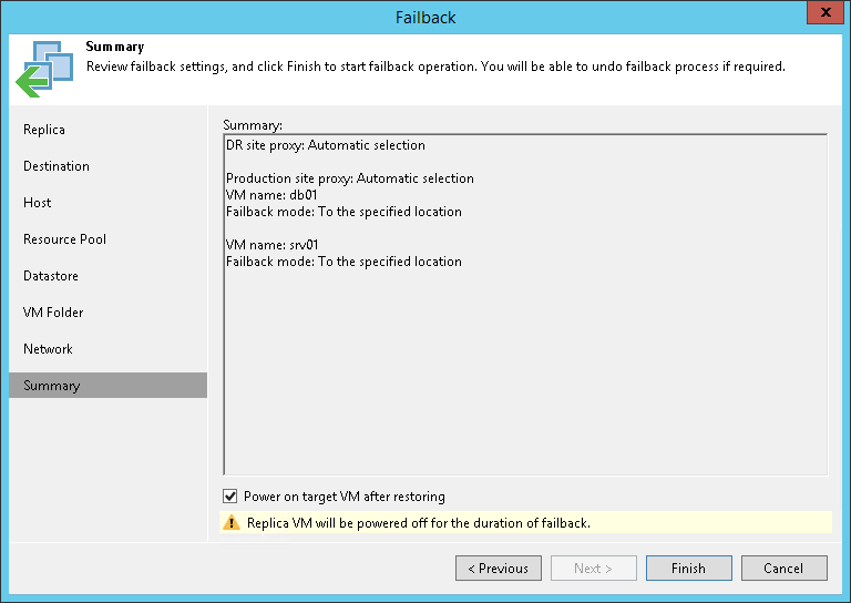- Check the specified settings and click Finish. Veeam Backup & Replication will restore the original VMs to the state of corresponding VM replicas.