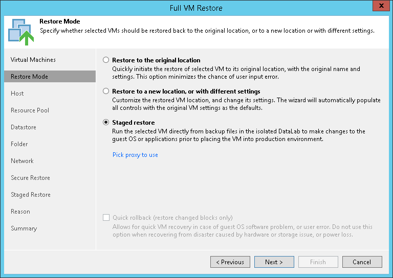 At the Restore Mode step of the wizard, choose the necessary restore mode and backup proxy for VM data transport: