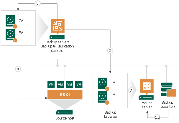 When you perform file-level restore, Veeam Backup & Replication performs the following operations: