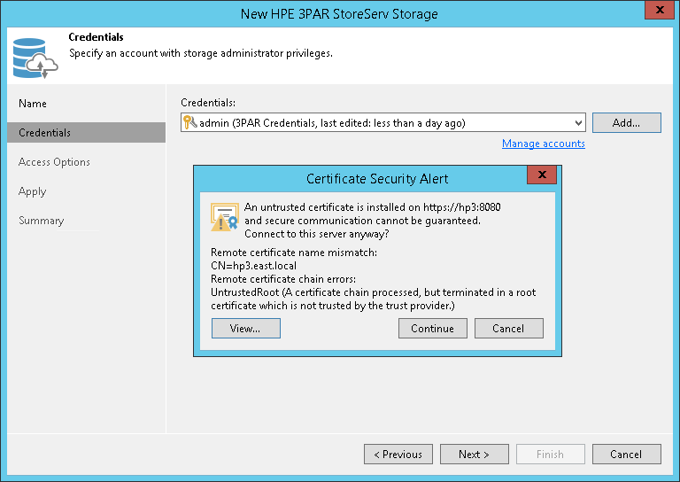 - From the Credentials list, select credentials to connect to the HPE 3PAR Web Services API Server. If you have not set up credentials beforehand, click the Manage accounts link or click Add on the right of the Credentials field to add the necessary credentials. For more information, see Managing Credentials.