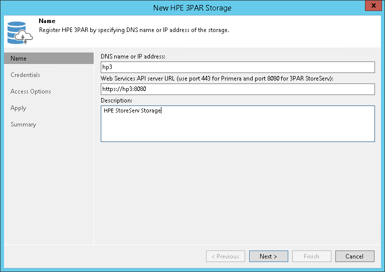 At the Name step of the wizard, provide information about the HPE 3PAR Web Services API Server.