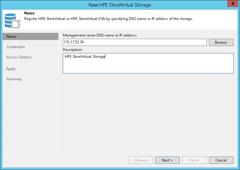 You can also type a DNS name or IP address of the storage management server or storage cluster in the Management server DNS name or IP address field.