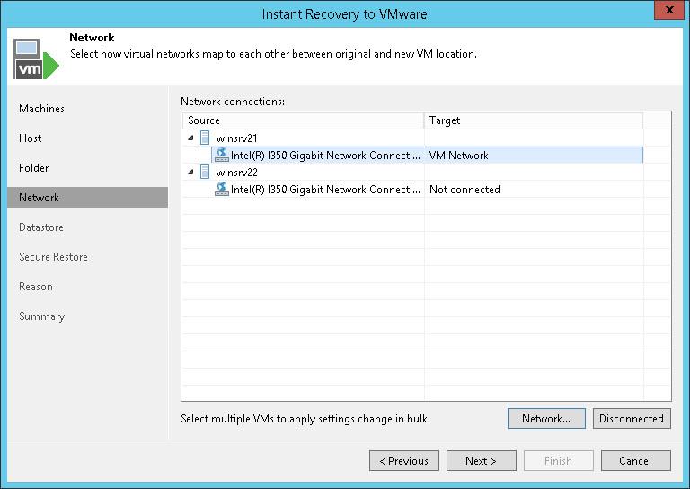 - The Select Network window displays all networks to which the target host or cluster is connected. In the list, select a network to which the restored VM must be connected after restore.