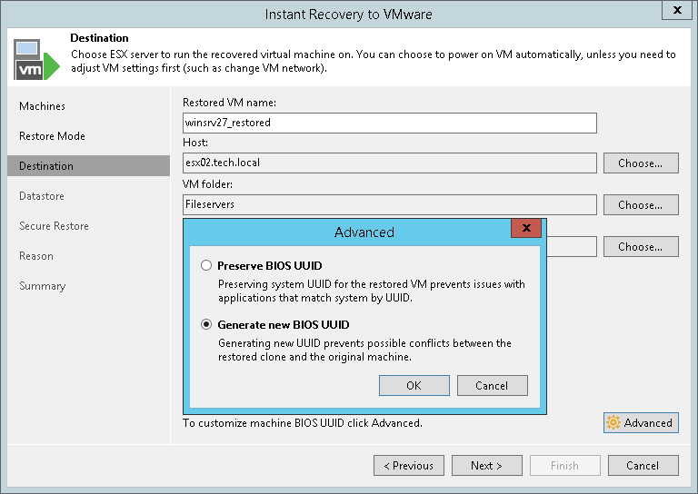 - Click the Advanced button and choose whether to preserve the BIOS UUID or generate a new BIOS UUID.