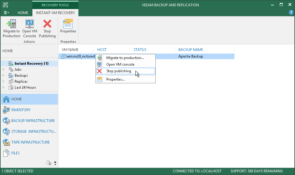 If your tests have failed, you can stop publishing the recovered VMs. This will remove the recovered VMs from the host that you selected as the destination for recovery. Note that all changes made in the recovered VMs will be lost.
