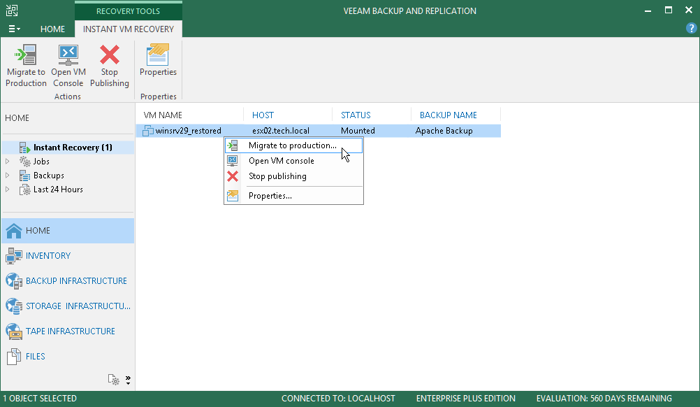 - In the working area, right-click a VM and select Migrate to production. Veeam Backup & Replication will launch the Quick Migration wizard.