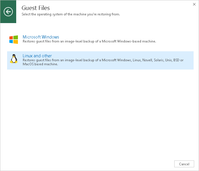- Click the VM whose files you want to restore and click Guest files > Linux and other on the ribbon.