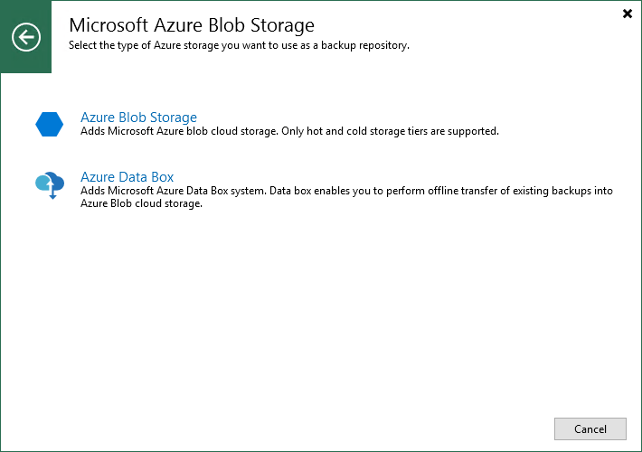 This is an archive version of the document. To get the most up-to-date information, see the current version. Step 2. Select Azure Storage Type At the Microsoft Azure Blob Storage step of the wizard, select one of the following storage types:Azure Blob StorageAzure Data Box