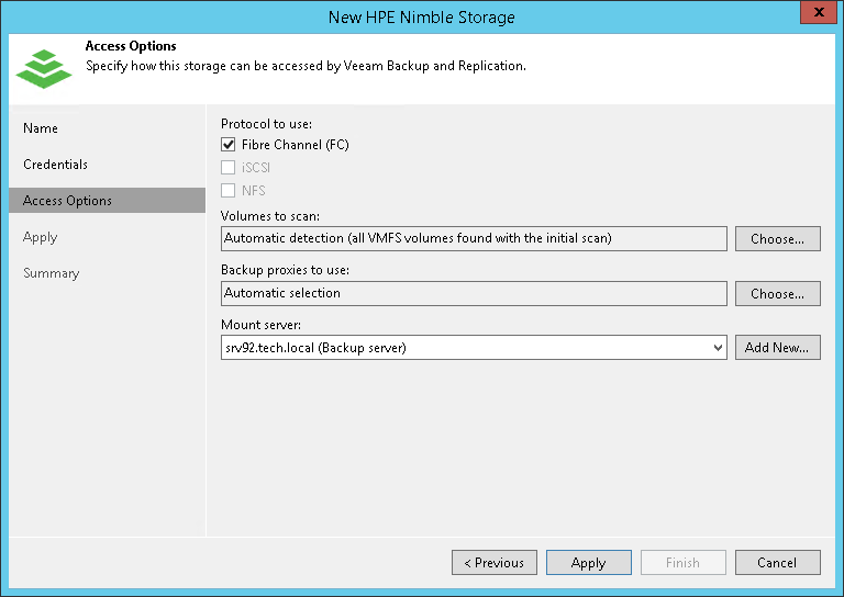 - Operations of storage rescan and Backup from Storage Snapshots are performed with the help of a backup proxy. On the right of the Backup proxies to use field, click Choose and define backup proxies that you want to use for these operations.
