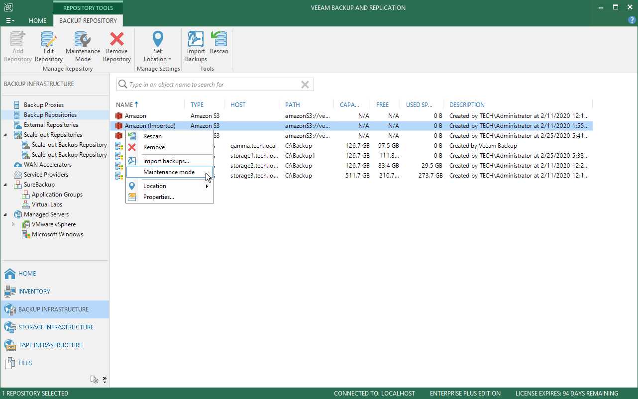 - In the working area, select an object storage repository and click Maintenance mode on the ribbon or right-click an object storage repository and select Maintenance mode.