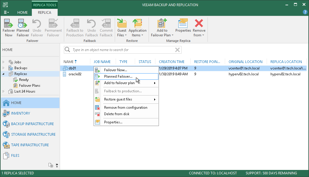 - Open the Home view, expand the Replicas node. In the working area, select one or more VMs and click Planned Failover on the ribbon. You can also right-click one or more VMs and select Planned Failover.
