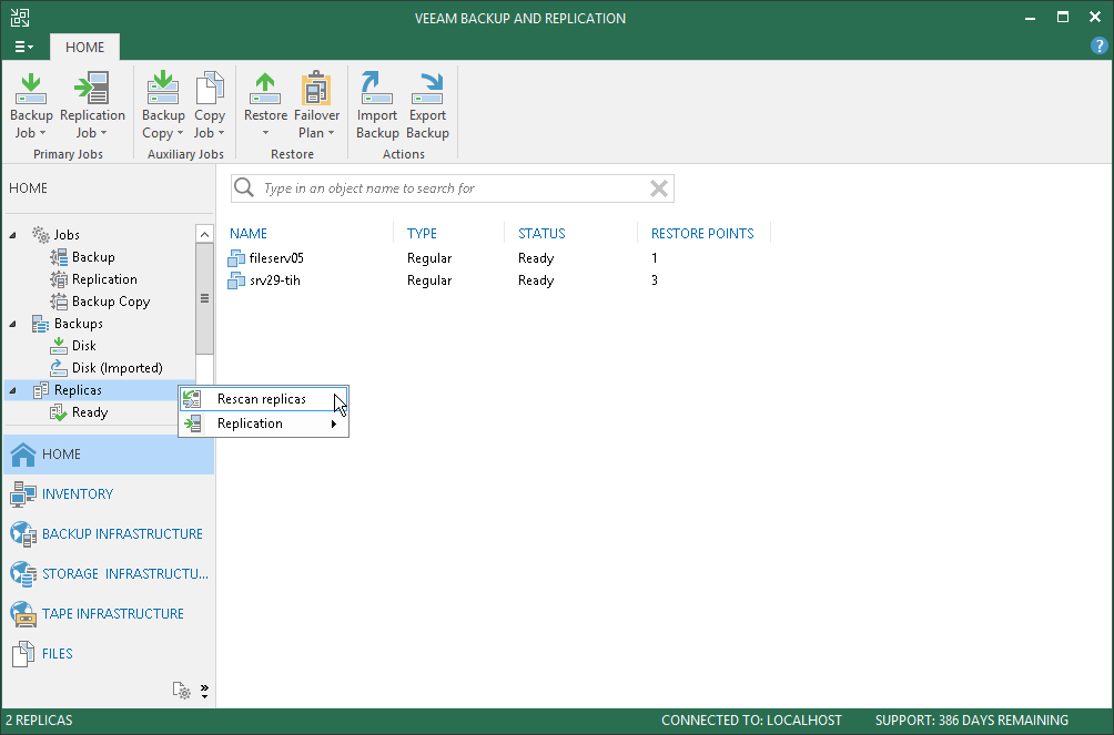 2. In the inventory pane, right-click the Replicas node and select Rescan Replicas.