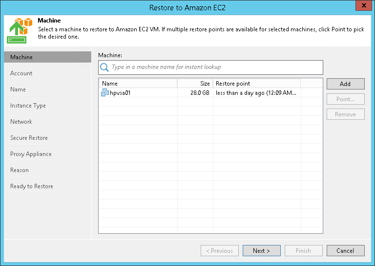 At the Machine step of the wizard, specify the machine that you plan to restore and specify a restore point to which you want to restore the machine.