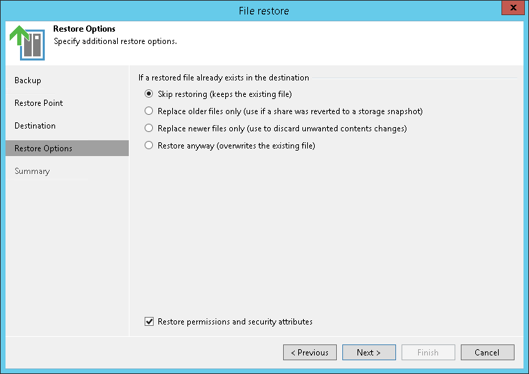 Select the Restore permissions and security attributes check box if you want the restored files to keep their original ownership and security permissions. If you do not select this check box, Veeam Backup & Replication will change security settings. The user account under which the Veeam Backup Service runs will be set as the owner of the restored objects. Access permissions will be inherited from the target folder to which the objects are restored.