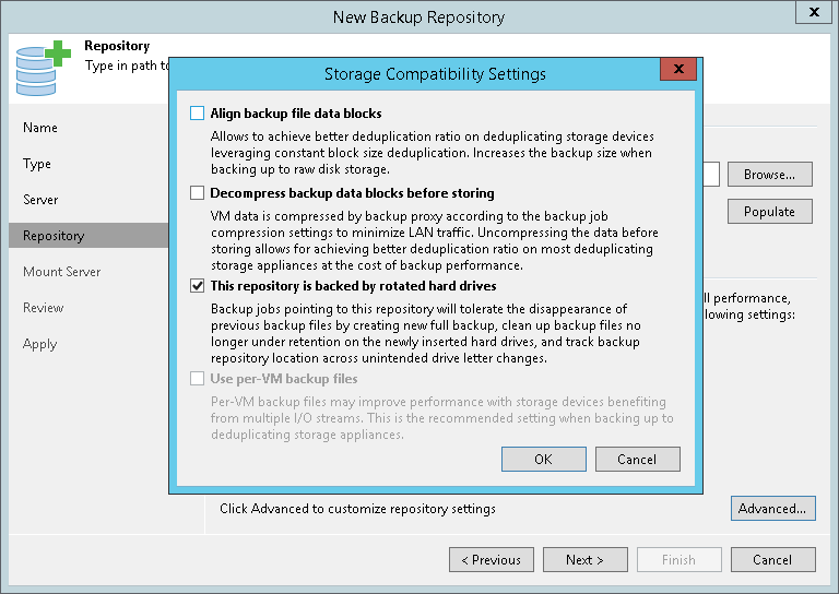 - Click the Advanced button and select the This repository is backed by rotated hard drives check box.