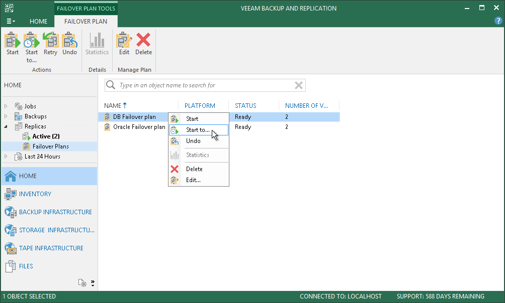 • You can fail over to a specific restore point of VM replicas. To use this option, you must run the failover plan with the Start to command and select the necessary date when restore points for VM replicas were created.