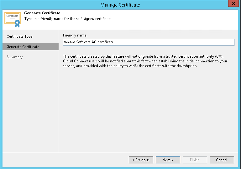 - Click Finish. Veeam Backup & Replication will save the generated certificate in the Shared certificate store on the Veeam backup server.