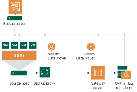 An SMB share cannot host Veeam Data Movers. For this reason, to communicate with the SMB share, you need to deploy a gateway server. Veeam Backup & Replication will automatically deploy a Veeam Data Mover on this gateway server. For more information, see Gateway Server.