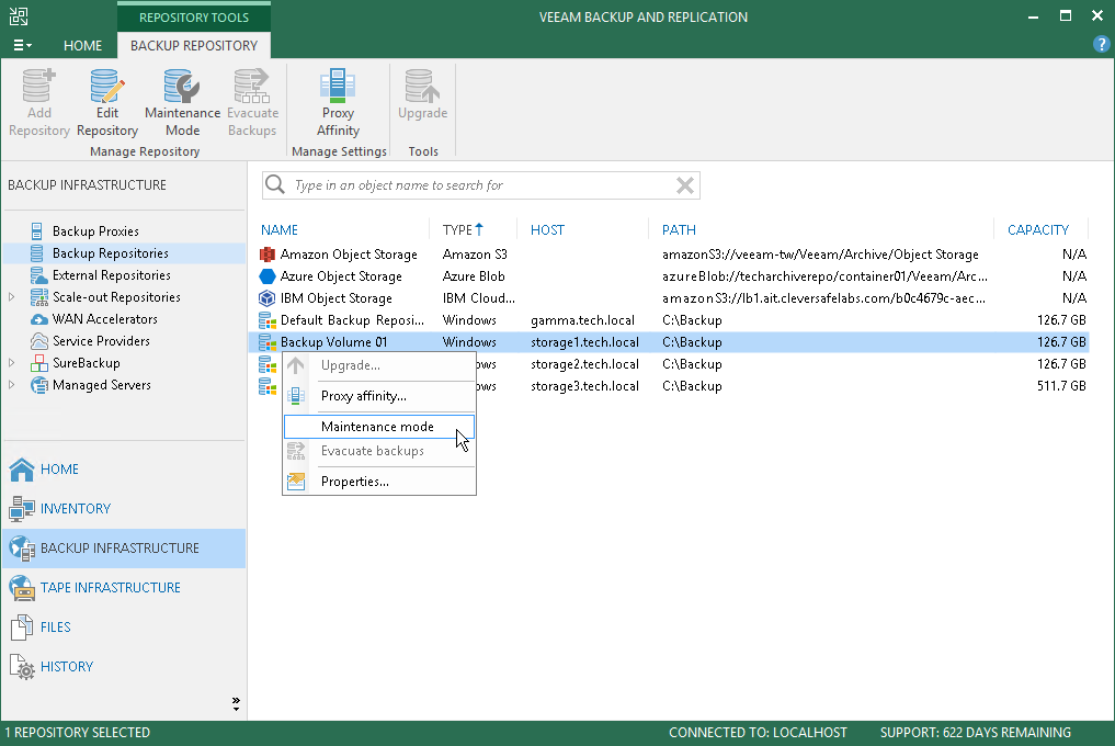 Veeam Backup & Replication allows you to put any of the performance extents of your scale-out backup repository into Maintenance mode. You can use this mode if you need to perform service actions, such as upgrading a performance extent or installing a patch on it. Putting a performance extent into maintenance mode is mandatory to evacuate backups, as described in Evacuating Backups from Extents.