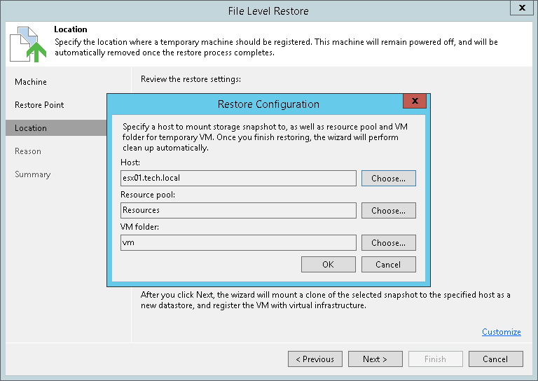 - Next to the VM folder field, click Choose and select a folder to which you want to place the temporary VM.