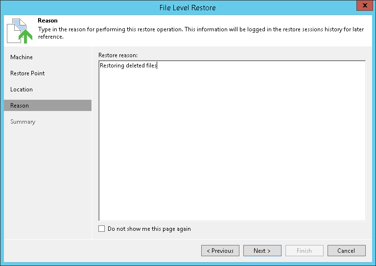 At the Reason step of the wizard, enter a reason for performing VM guest OS files restore. The information you provide will be saved in the session history, and you will be able to view it later.