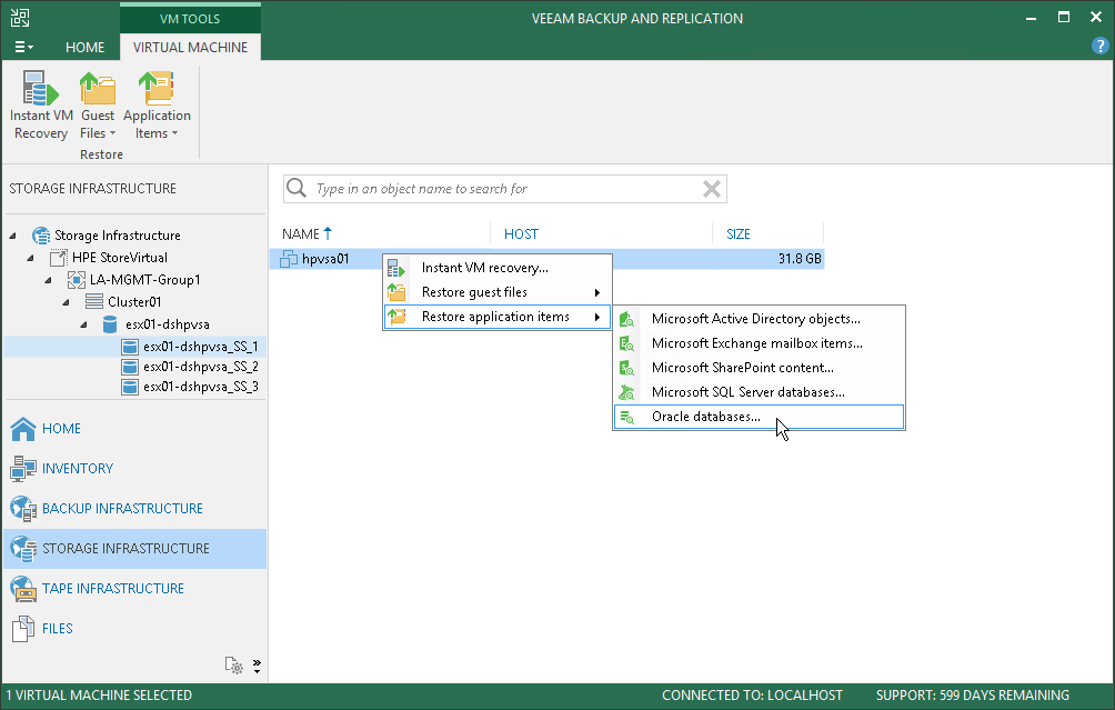 - Open the Storage Infrastructure view. In the inventory pane, select the necessary volume snapshot. In the working area, select a VM running Oracle and click Application Items > Oracle on the ribbon. You can also right-click the VM and select Restore application items > Oracle databases. In this case, you will pass immediately to the Location step of the wizard.