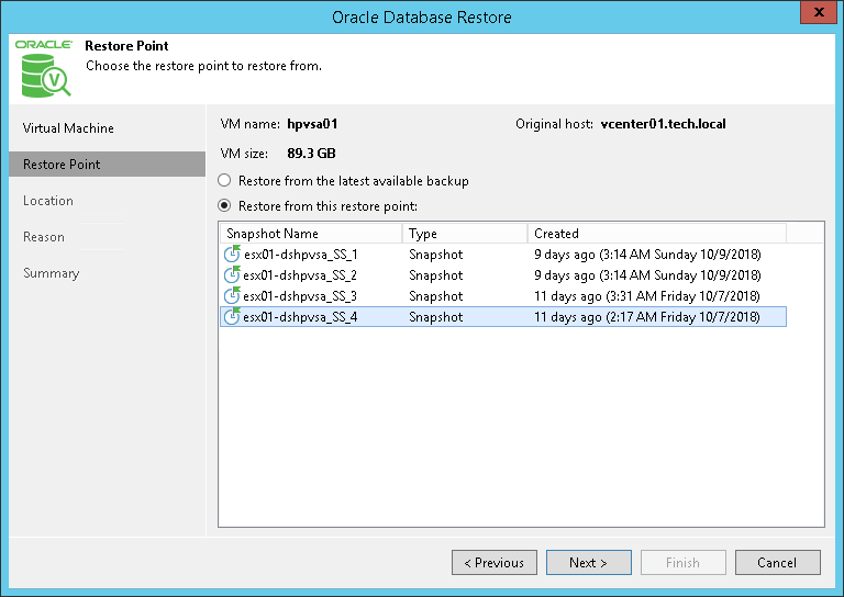 At the Restore Point step of the wizard, select a restore point from which you want to restore an Oracle database. Every storage snapshot acts as an independent restore point.