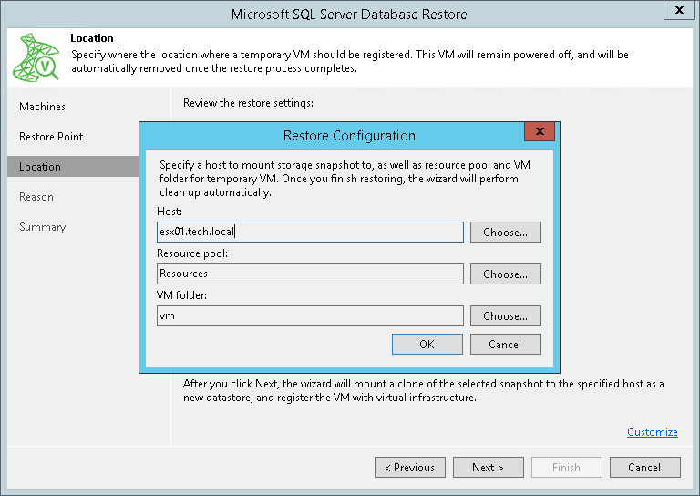 At the Location step of the wizard, select an ESXi host to which the clone/virtual copy of the storage snapshot must be mounted. On the selected ESXi host, Veeam Backup & Replication will create a temporary VM and mount disks of the virtualized Microsoft SQL Server to this temporary VM.