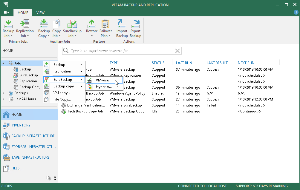 - Open the Home view. In the inventory pane, right-click SureBackup under Jobs and select SureBackup > VMware.