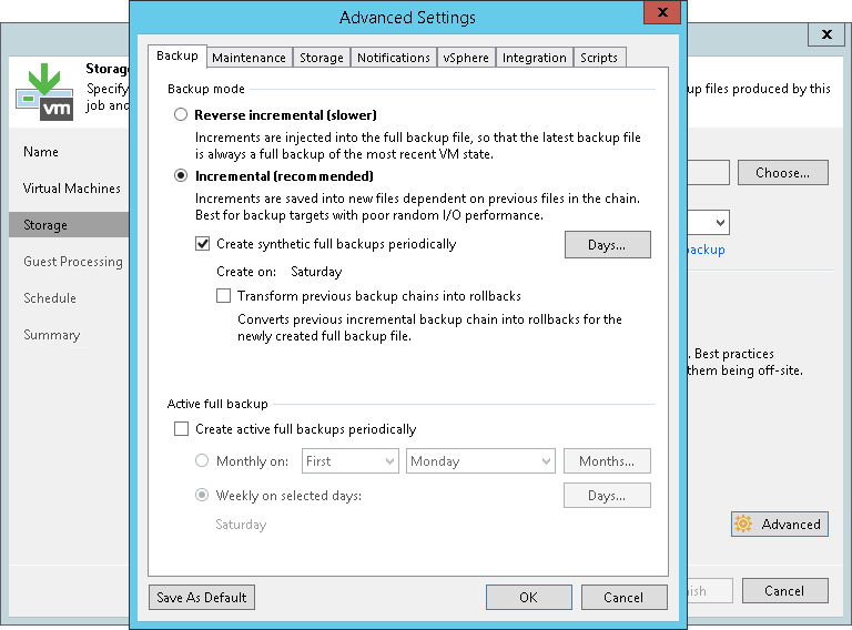 To create synthetic full backups, you must enable the Create synthetic full backups periodically option and schedule creation of synthetic full backups on specific days in the backup job settings.