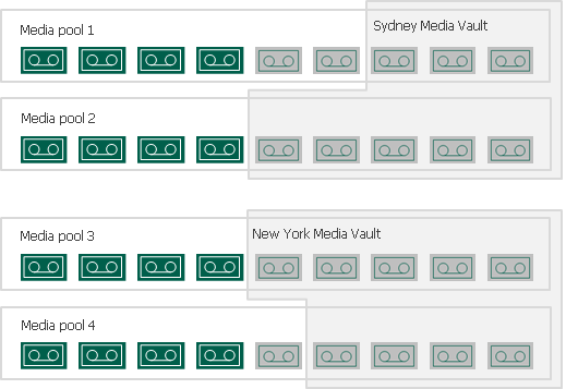 Vaults visualize information about tapes. They store information about original location of tapes, such as library and media pool, data written to tapes and retention terms for it. Vaults are not limited to any original location of tapes: you can place tapes from different libraries and media pools to one vault.