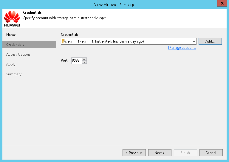- From the Credentials list, select credentials to connect to the storage system. If you have not set up credentials beforehand, click the Manage accounts link or click Add on the right of the Credentials field to add the credentials. For more information, see Managing Credentials.