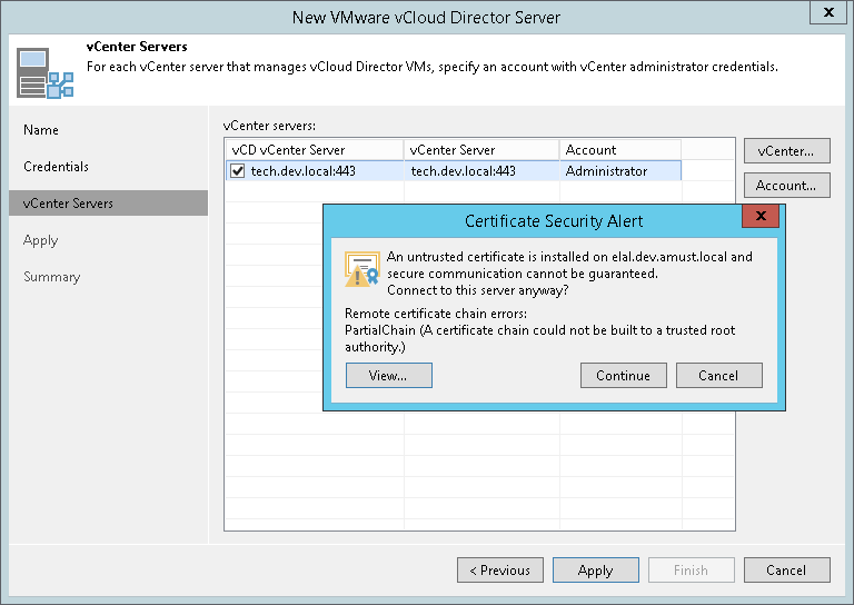 - If you do not trust the server, click Cancel. Veeam Backup & Replication will display an error message, and you will not be able to connect to the server.