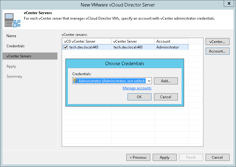 - Click Account on the right and select credentials to connect to the vCenter Server. By default, Veeam Backup & Replication uses the same credentials that you have specified for vCloud Director at the previous step of the wizard.