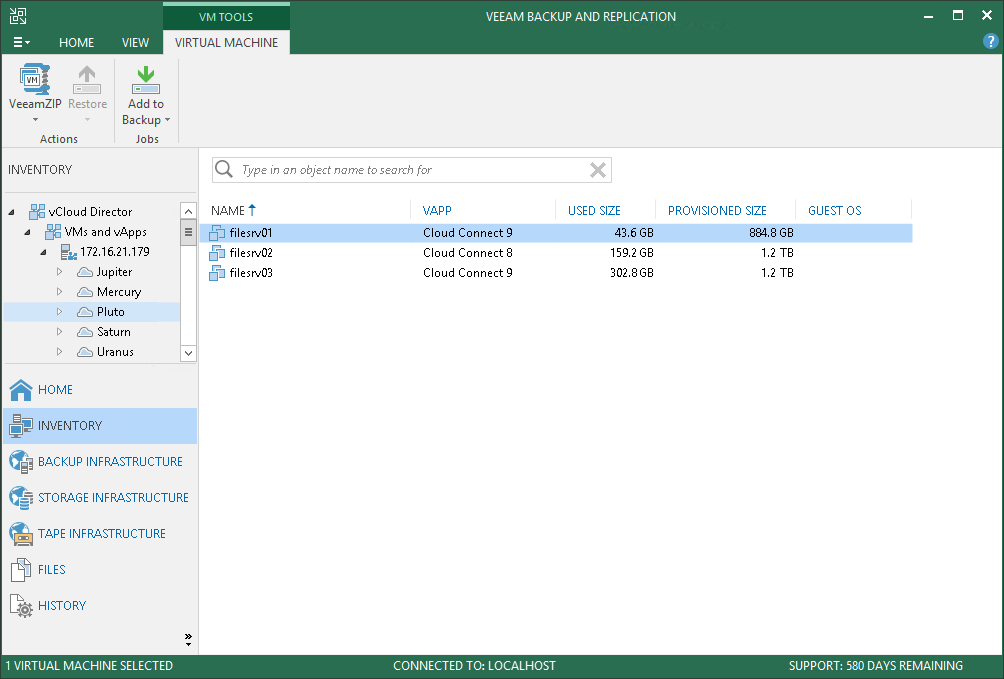 The hierarchy of the vCloud Director server will become available in the inventory pane. VMs managed by vCloud Director will be displayed in the working area. You can work with these VMs just as if you worked with VMs managed by vCenter Servers or registered on ESXi hosts in your backup infrastructure.