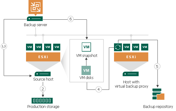 - When the VM processing is complete, VM disks are detached from the backup proxy and the VM snapshot is deleted.