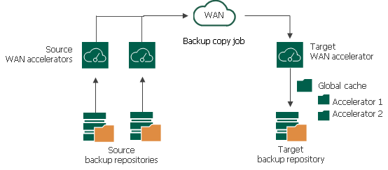 When one target WAN accelerator is used by several source WAN accelerators, Veeam Backup & Replication can copy data blocks between global cache of these WAN accelerators. This mechanism works if there are no matching backups of VMs in the target backup repository, but matching data is available in cache of other WAN accelerators.