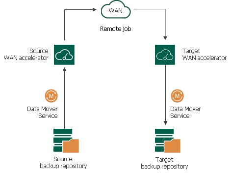 For WAN acceleration, Veeam Backup & Replication uses dedicated components — WAN accelerators. WAN accelerators are responsible for global data caching and data deduplication. Technically, WAN accelerators add a new layer in the backup infrastructure — between the Veeam Data Movers on the source side and the Veeam Data Mover on the target side.