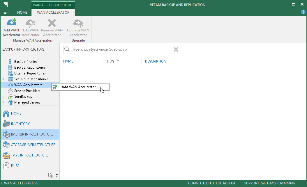 - Open the Backup Infrastructure view, in the inventory pane select WAN Accelerators and click Add WAN Accelerator on the ribbon.
