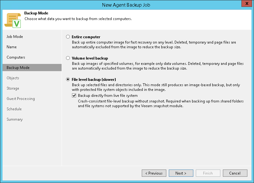 - [For file-level backup] If you want to perform backup in the snapshot-less mode, select the Backup directly from live file system check box. With this option selected, Veeam Agent for Linux will not create a snapshot of a backed-up volume during backup. This allows Veeam Agent to back up data residing in file systems that are not supported for snapshot-based backup with Veeam Agent for Linux. To learn more, see the Snapshot-Less File-Level Backup section in the Veeam Agent for Linux User Guide.
