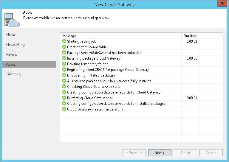At the Apply step of the wizard, Veeam Backup & Replication will install the components on the cloud gateway server. Wait for the required operations to complete and click Next to continue.