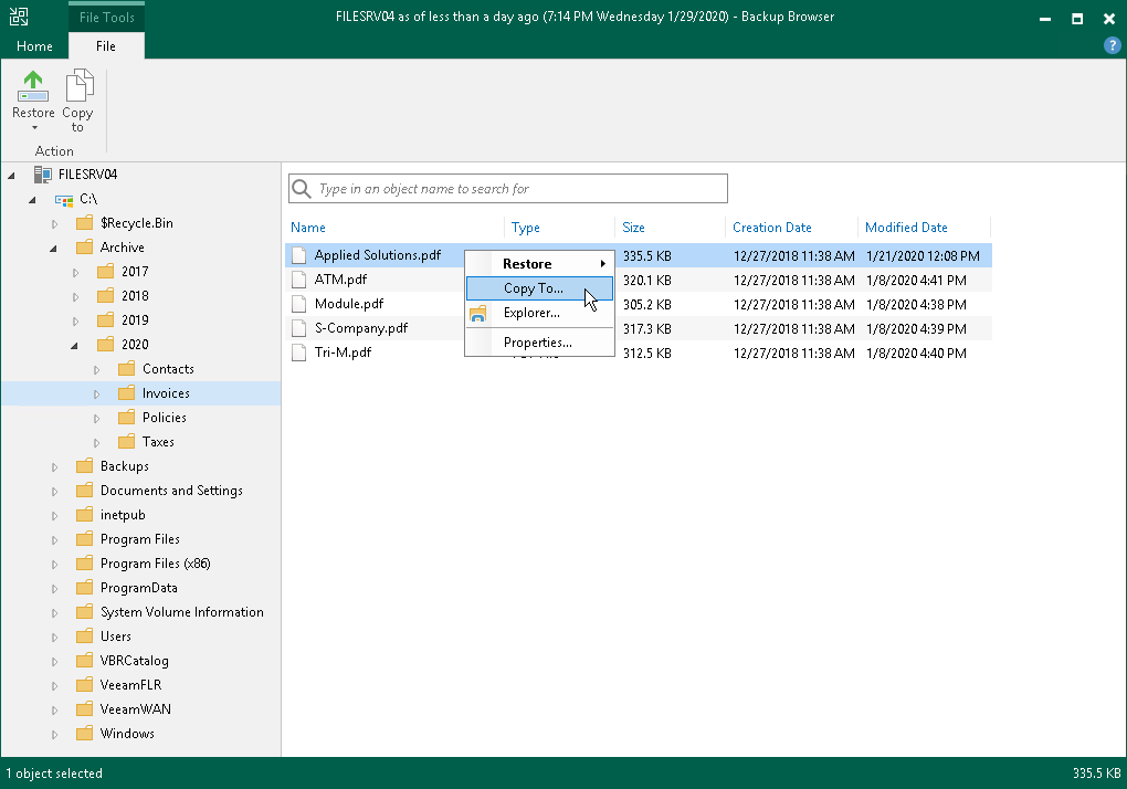 - In the Veeam Backup Browser, Veeam Backup & Replication will display the file system tree of the backed-up computer. Right-click the necessary file or folder and select one of the following options: