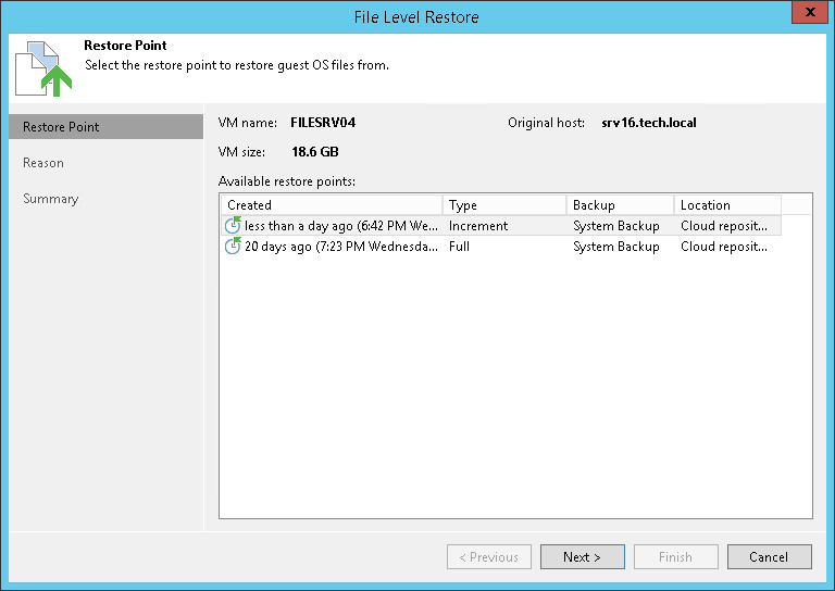 - At the Restore Point step of the wizard, select the necessary restore point.