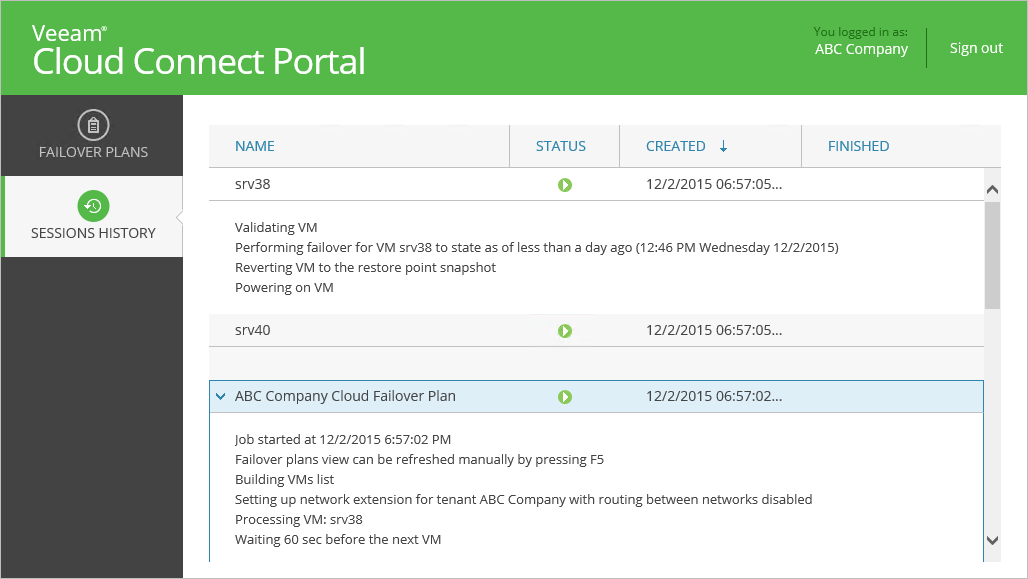 With Veeam Cloud Connect Portal, you can monitor the failover plan execution process as well as view results for finished failover tasks. Every run of a cloud failover operation and VM processing initiates a new session. When you start or undo a cloud failover plan, the Sessions History section automatically opens. You can also access the Sessions History section manually at any time.