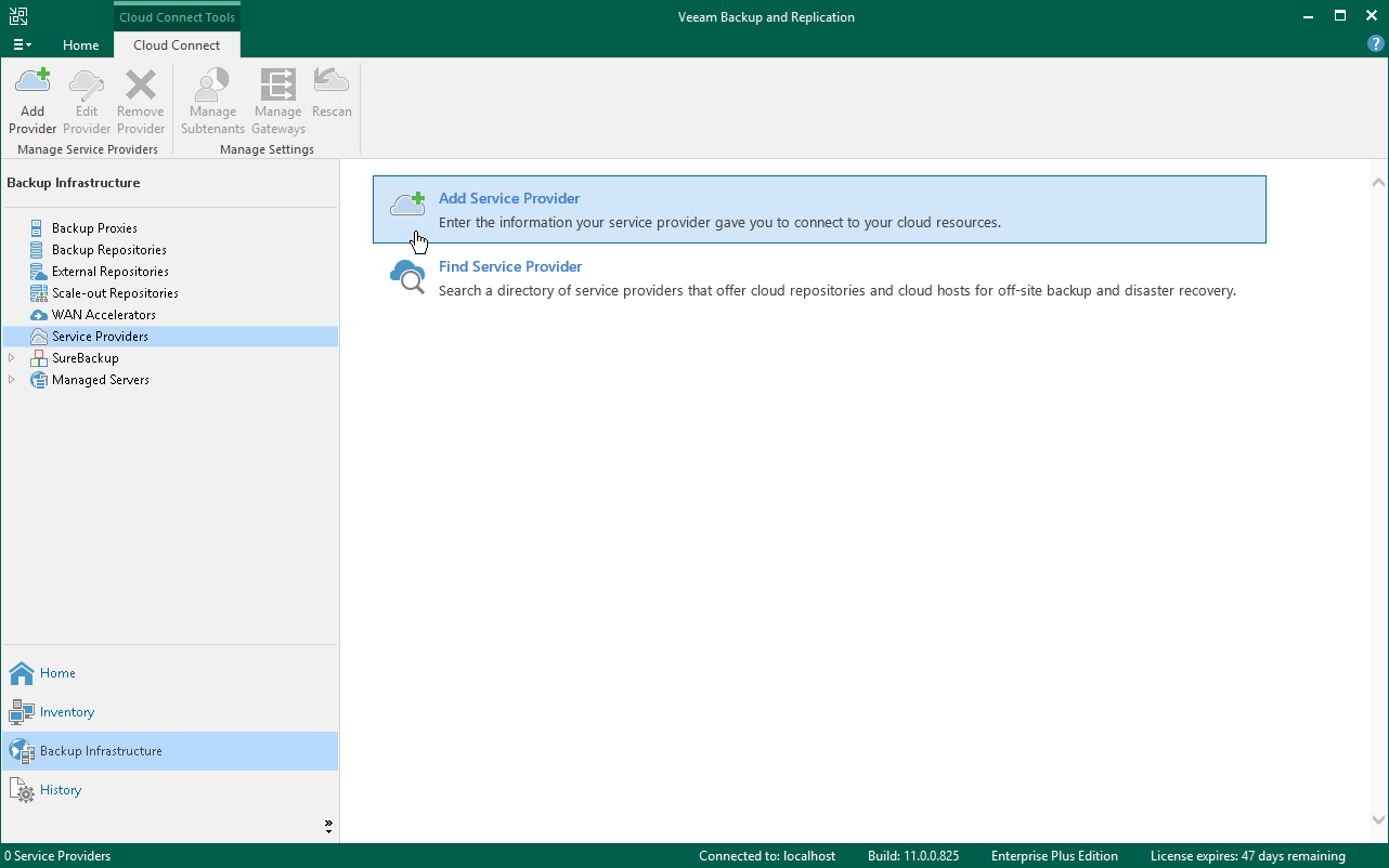 • Open the Backup Infrastructure view. Select the Service Providers node in the inventory pane and click Add Provider on the ribbon.