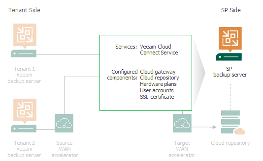 The Veeam Cloud Connect infrastructure is organized around the Veeam backup server running on the SP side. The SP Veeam backup server is a configuration and control center of the Veeam Cloud Connect infrastructure. The SP uses the Veeam backup server to set up the Veeam Cloud Connect infrastructure and deliver Backup as a Service and Disaster Recovery as a Service to tenants.