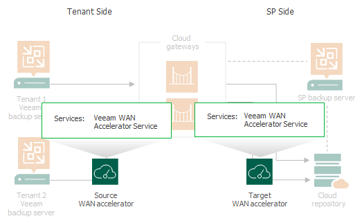 WAN accelerators in the Veeam Cloud Connect infrastructure run the same services and perform the same role as WAN accelerators in a regular backup infrastructure. When configuring backup copy or replication jobs, tenants can choose to exchange data over a direct channel or communicate with the cloud repository or cloud host through WAN accelerators. To pass VM data through WAN accelerators, the SP and tenants must configure WAN accelerators in the following way: